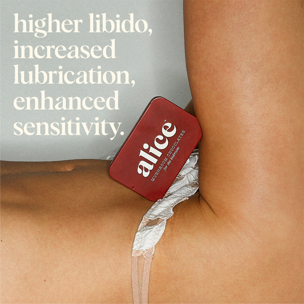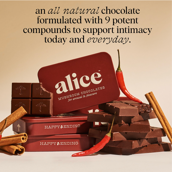 The Alice Mushroom Chocolate Happy Ending is crafted to support intimacy, pleasure, and long-term sexual wellness. Each delicious square blends rich dark chocolate with a powerful formula of adaptogenic mushrooms and aphrodisiac herbs — delivering both immediate effect and cumulative benefit over time.